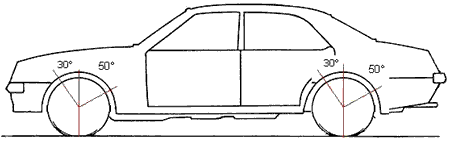 Reifen im Bereich 30° nach vor und 50 ° nach der Mitte des Rades gemessen abgedeckt sein muss.