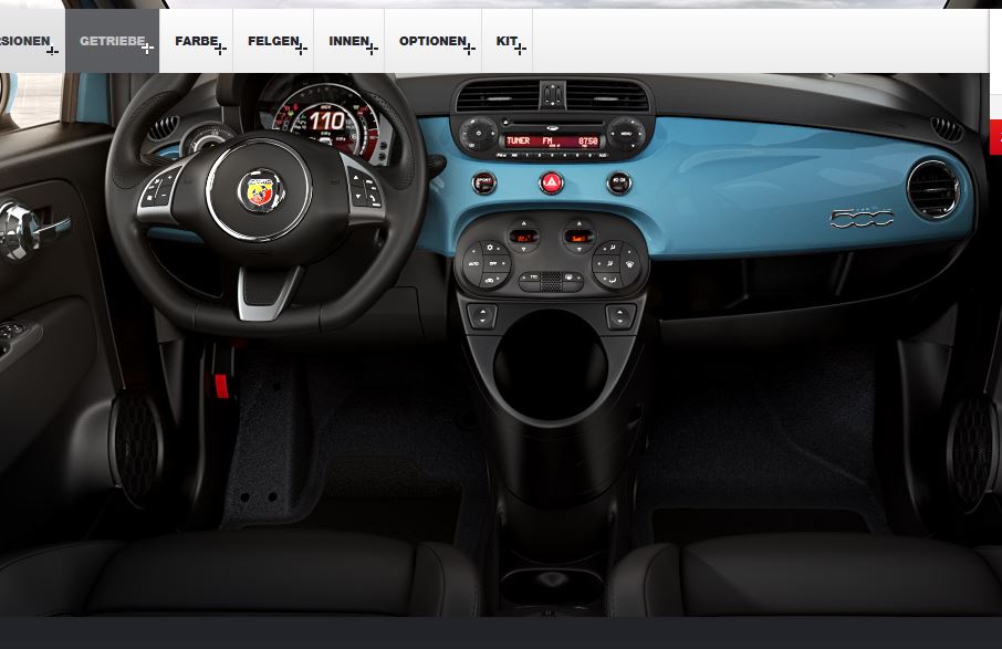 • Sehr ärgerlich! Der Konfigurator von Abarth ist aber auch Mist. Ständig hängt er sich auf und oft wird der Innenraum falsch dargestellt. Ich wollte die beiden Chromblenden in Schwarz, ebenso das Armaturenbrett, ging leider nicht beim Custom/Tourismo... falls die Teile also getauscht werden und du die schwarzen Teile mitnehmen darfst, kannst du dich ja mal melden! :pfeifen: