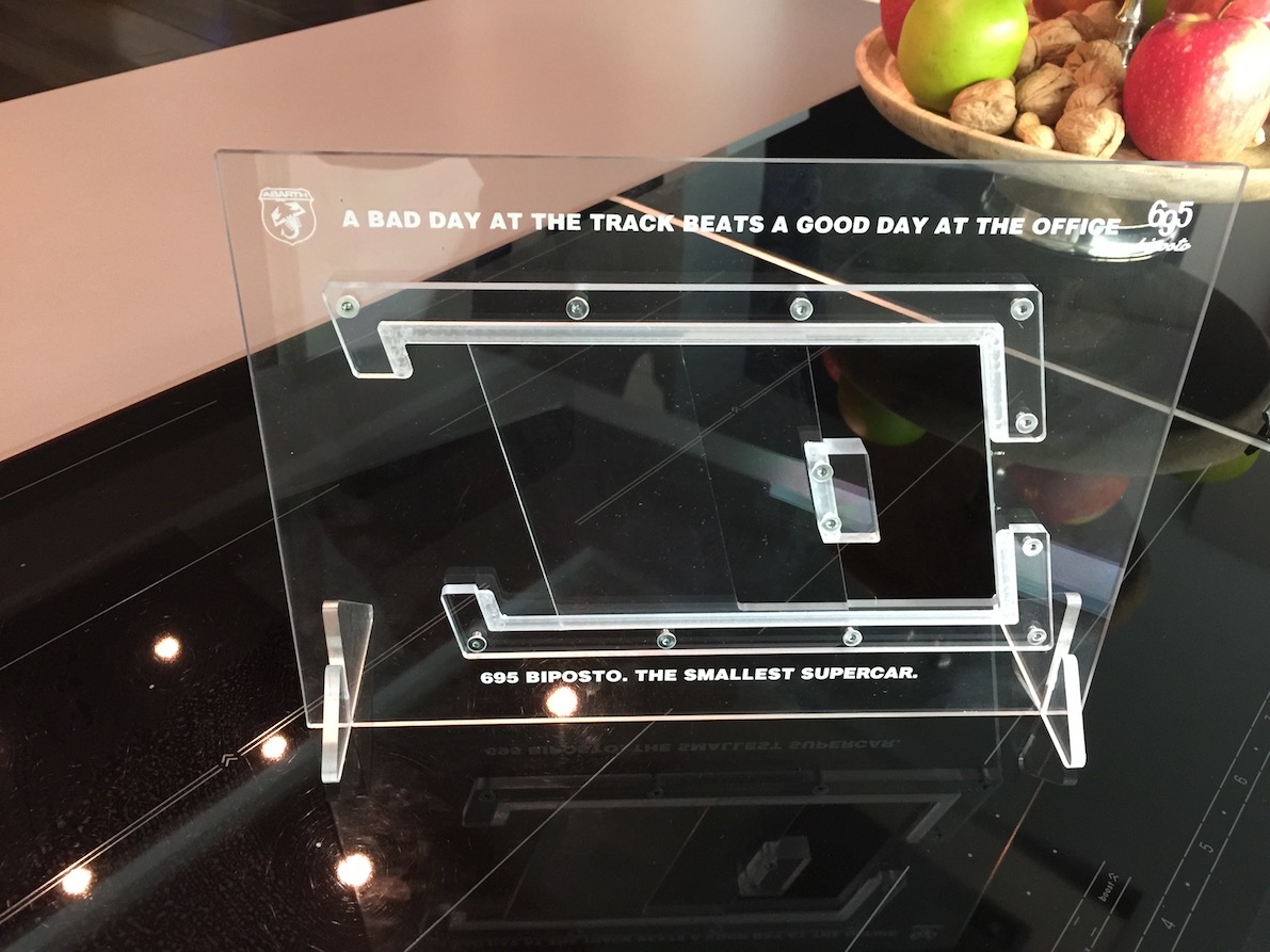 Fangen wir einmal mit dem Biposto Schlüsselanhänger an, dann gibt´s eine schöne Metallbox, in der sich neben einem Replica - Fenster noch zwei weitere Aufsteller bzw. Metallembleme befinden, sowie ein Besitzzertifikat mit der FgstNr. und ein kleiner Prospekt. Weiters gab´s noch eine Abarth Ledermappe für die Bordutensilien sowie ein Abarth - Bag für Pannenkreuz usw.