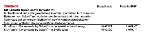 Im ABARTH Bestellsystem für den A500 sind die Sabelt Sitze jetzt als Alternative zu den Seriensitzen bestellbar: