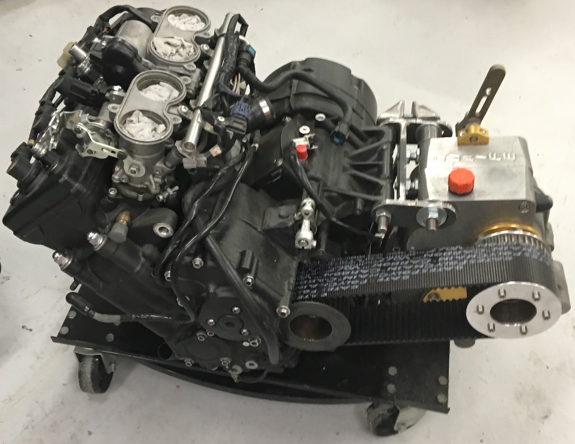 Jelle geht zum Motorblock und erklärt: „Das ist ein 998 cm 3 Block von einer Yamaha R1. Im Auto, das draußen steht, leistet dieser Motor 190 PS. Bei 140 km/h übersteigt die Drehzahl bereits 10.000 U/min. Die Höchstgeschwindigkeit liegt bei 235 km/h. Bei 15000 U/min weiß man nicht was man hört. Bis ein solches Motorrad in einen Kleinwagen wie den Abarth passt und funktioniert, sind einige technische Herausforderungen zu meistern, zum Beispiel hat ein Motorrad keinen Rückwärtsgang. Um das zu lösen, bauen wir ein Getriebe mit Sperrdifferential von Quaife ein, das uns tatsächlich sechs Vorwärtsgänge und sechs Rückwärtsgänge gibt. Bei meinem Auto ist der Motorblock umgekehrt montiert, damit er gut in den originalen Motorraum hinten hinter der Hinterachse passt.“