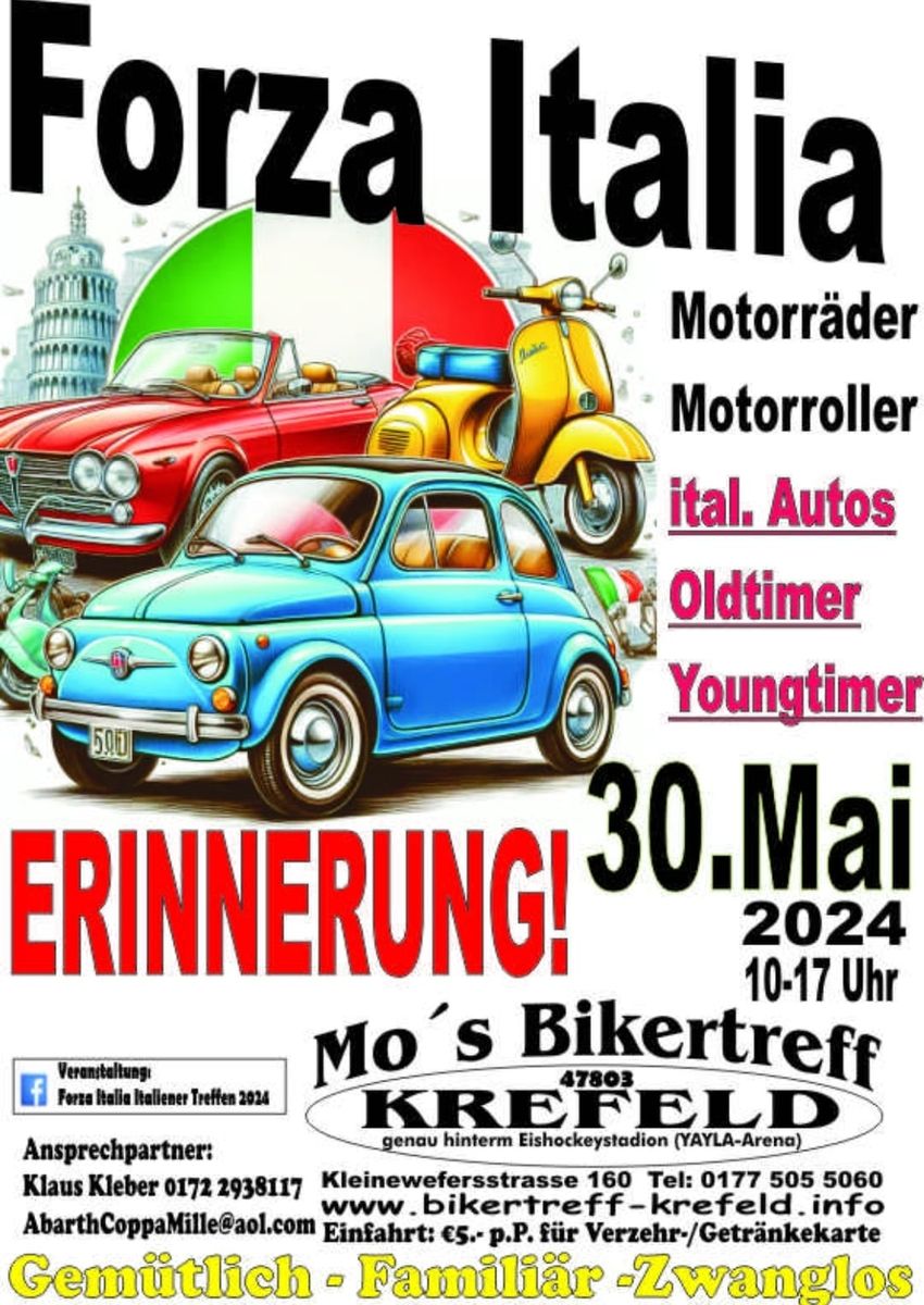 Mo´s Bikertreff, der beliebten Benzin-Location an der Niederrheinhalle (hinter der YAILA-Arena). Es ist wieder Zeit für das 7. FORZA ITALIA und das 2. ITALO FORUM TREFFEN. Marken.- und typenoffen für alle italienischen Old.- Youngtimer und Neufahrzeuge mit 2 - 3 - 4 Rädern (Moppeds, Scooter, Motorräder, Apes, Autos), um die 19.000 qm Parkfläche mit tollen Fahrzeugen aus dem europäischen Süden zu füllen. Teilnehmen kann und darf Jedermann/frau ohne Anmeldung gegen eine Gebühr von 5.- EUR für eine Verzehr.- und Getränkekarte, die bei Einfahrt in das Gelände von den Insassen im Fahrzeug erhoben, und bei Mo´s Gastro voll eingelöst und angerechnet wird. Für die Frühaufsteher ist ab 9.00 Uhr das Frühstücksbuffet eröffnet. Die Fahr.- und Parkwege sind ausgeschildert, sanitäre Anlagen vorhanden und ein großer Biergarten (mit lekker Essen + Trinken für alle Wind.- und Benzinfüchse