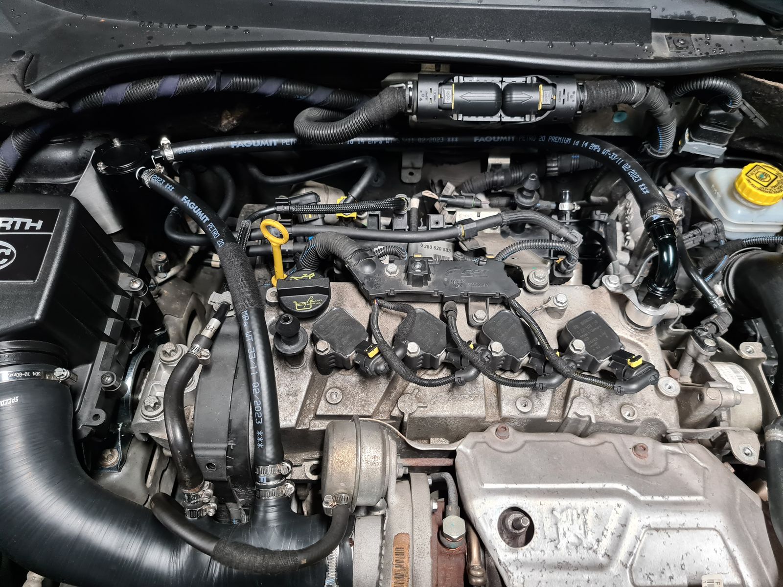Achje da kam noch die Edelstahlplatte, hĂ€tte ich fast vergessen ,die zur Befestigung des Oil Catch Tank benötigt wird ; diese habe ich selbst angefertigt aus einem Abfallblech aus Edelstahl . Die ich dann mit groĂer MĂŒhe bearbeitet habe also sprich um diese dann an den 2 herausragenden Gewindebolzen vom Luftfilterkasten / Radkastenstelle hoffe versteht was ich meine