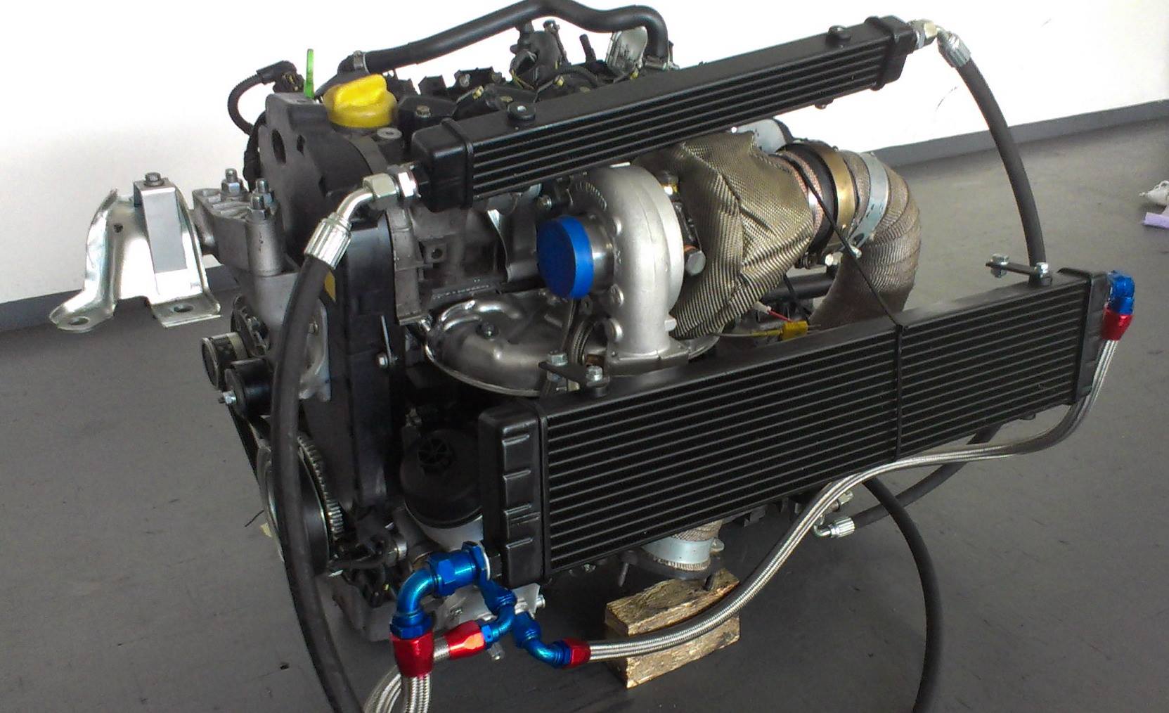 Info Ölkühler, dass Ölvolumen ist mit dem Ölkühler auf knapp 4L angestiegen. Ich denke, dass mit dieser Maßnahme kein größerer Wasserkühler mehr nötig wäre (hat sich aber leider bei mir erledigt..). Evans Power Cool für das Kühlsystem macht auch Sinn, wenn man es nur ab und zu auch mal am Track krachen lässt (füllt man nur 1 mal im Autoleben ins Kühlsystem!). Info und Bezugsquellen: http://www.evanscoolants.co.uk…for-performance-cars.html oder http://www.sandtler24.de/evans-power-cool-180 . Achtung, Kühlsystem muss vorher mit einer Reinigungsfluid gesäubert/durchgespült werden! Übrigens das Ölkühlerset kann direkt bei G-Tech geordert werden (Anbei ein Foto wo er ersichtlich ist - natürlich in verschiedene Größen vorhanden - hier handelt es sich um einen Rennmotor inkl. kleinen Getriebeölkühler).