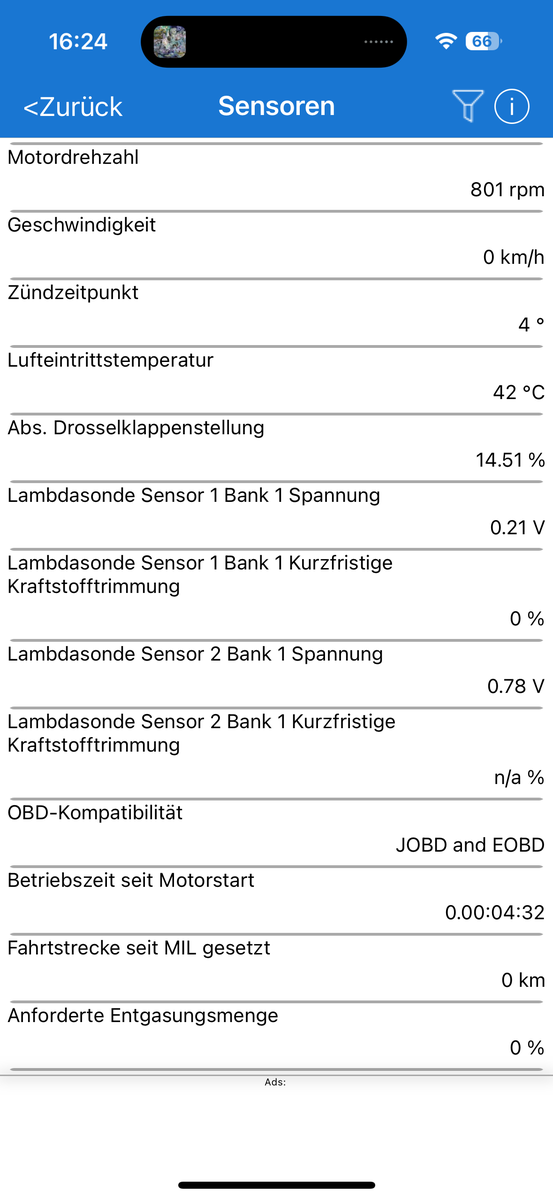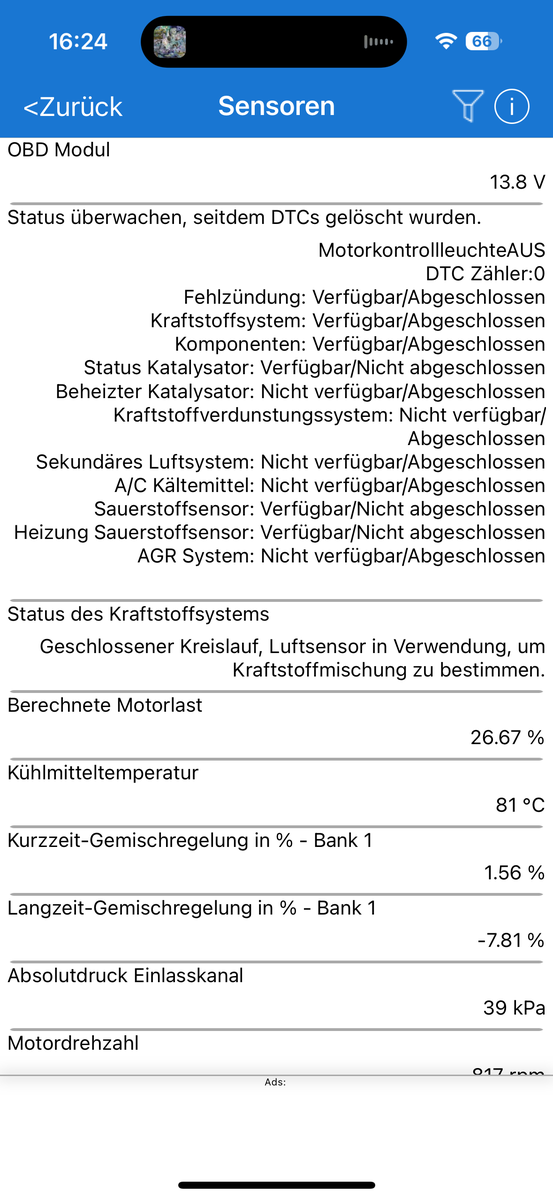 PS eben noch gesehen, dass das Fahrzeug einen Umgebungsdruck von ebenfalls 93kPa anzeigt was 1:1 dem Wert des Saugrohrdrucksensors entspräche. DAS macht garkeinen Sinn für mich. So viel Falschluft kann garnicht vorhanden sein damit in der Ansaugbrücke Umgebungsdruck herrscht