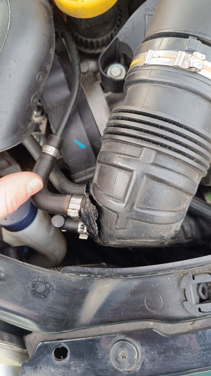 • Wurde auch schon geklebt. Wahrscheinlich beim Ölwechsel zu grob gewesen. Das Knie geht vom Luftfilter zum Turbo. Wundert mich eigentlich das keine MKL leuchtet.