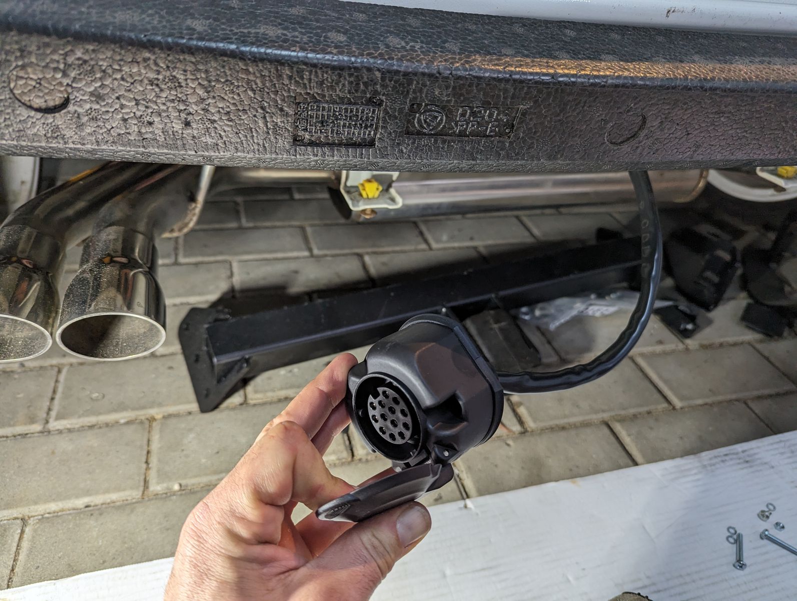 Die Anhängerkupplung ansich ist auch gut passend. Auf der rechten Seite am Auspuffhalter wurde es etwas eng,aber ich musste nichts abschneiden. Der Kugelkopf wird von unten gesteckt. Dazu muss unter dem Gitter ein viereckiges Loch hineingeschnitten werden,was man allerdings nur sieht,wenn man unter dem Auto liegt. Die Steckdose habe ich auch so verbaut wie einige das hier im Threads gemacht haben. Nach unten bündig mit dem Diffusor. So hat das ganze einen sauberen Abschluss. Man muss sich dafür nur ein Stück Aluwinkel biegen und verschrauben,damit die Dose später nach unten zeigt und eben an der richtigen Stelle mit einem Kreislochbohrer ein Loch reinschneiden.