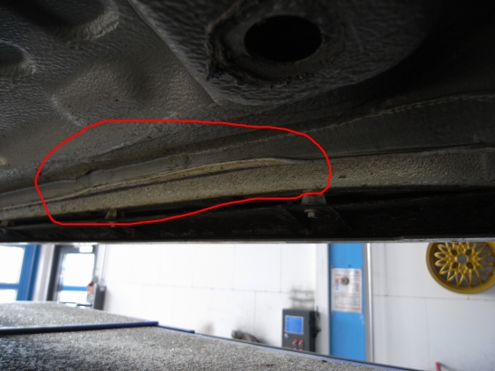 Das Auto wurde an der, am Kunststoffschweller gekennzeichneten Stelle mit weichen, großflächigen Gummiklötzen angehoben. Das Ergebnis ist deutlich sichtbar.