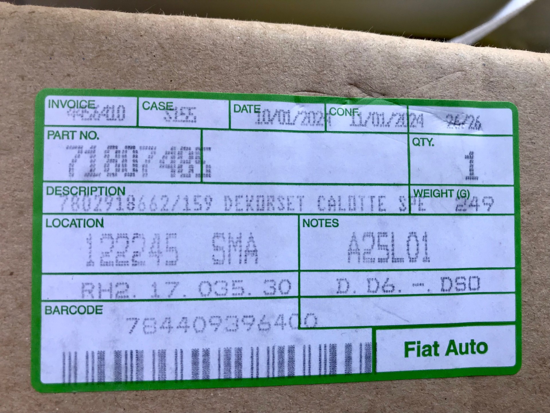 Hier die Bilder von der Innenseite der Spiegel mit Code Sticker (keine Ahnung ob das der Farbcode Ist, aber sonst habe Ich nur noch ein Foto von dem Original Ersatzteil-Karton mit Label, und dann habe Ich noch ein Foto von den Spiegelkappen selbst gemacht. Die Spiegel sind in diesen weichen Schaumstofftaschen auf denen sie auf dem Foto stehen eingeschlagen. Dann kommen sie in den Originalen Fiat Ersatzteilkarton, und dieser war dann noch und wird wieder in einen festen Transport-Karton gelegt. So habe Ich die Spiegelkappen vom E-Bay Store des Autohaus Heidenreich geliefert bekommen im Januar 2024. LG, Alex